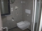 gefliestes WC, Dusche, Eckwaschtisch Fön, Kosmetikspiegel Fußbodenheizung